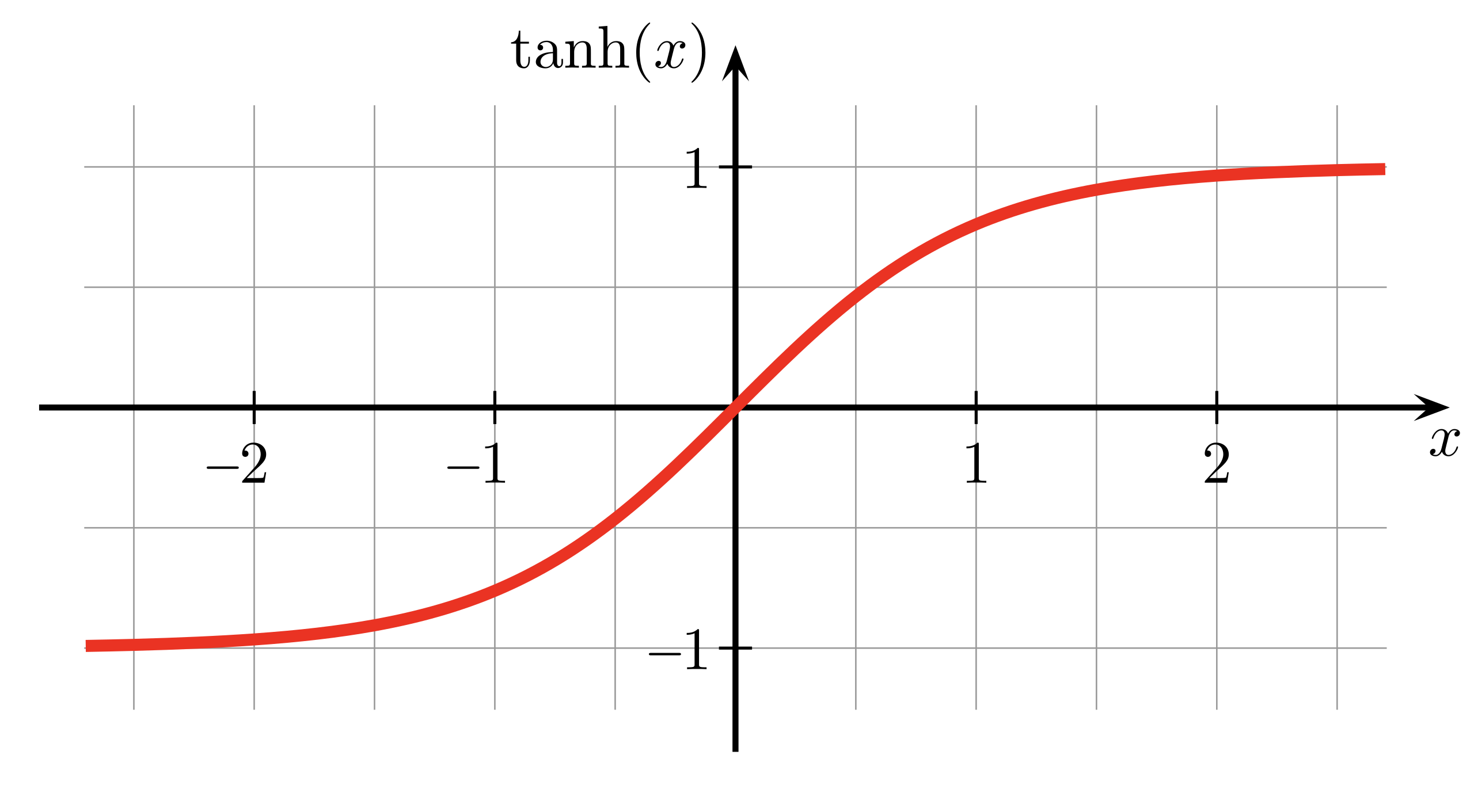 - The range of a hyperbolic tangent function is between -1 and 1. The shape of the graph resembles that of sigmoid function. Compared to the sigmoid function, the slope increases more rapidly as $x$ approaches closer to 0. Tanh activation function can be used to represent the normalized value of a pixel(0~255).